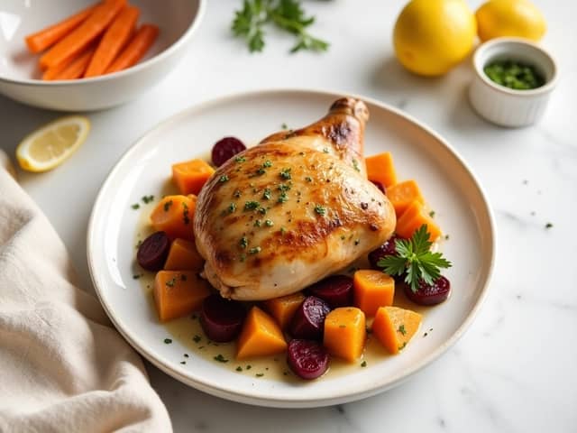 - Place the chicken on top of the vegetables and roast for 35 minutes, or until the chicken is cooked through and the vegetables are tender.